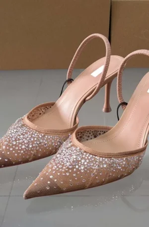 2024 Summer New Women’s Sandals Water Diamond Bright Mesh High Heels Footwear Elegant Slingback Pointed Slip on Party Lady Shoes